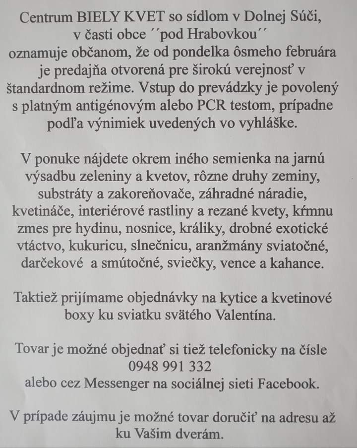 V prílohe je zverejnený oznam záhradníctva a kvetinárstva Biely Kvet.
